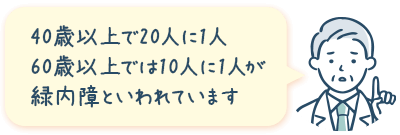 眼の病気の中には初期には自覚症状がなく、気付いた時にはすでに進行してしまっているものもあります。特に緑内障は40歳以上の約5%(20人に1人)が発症すると言われており、決して珍しい病気ではありません。